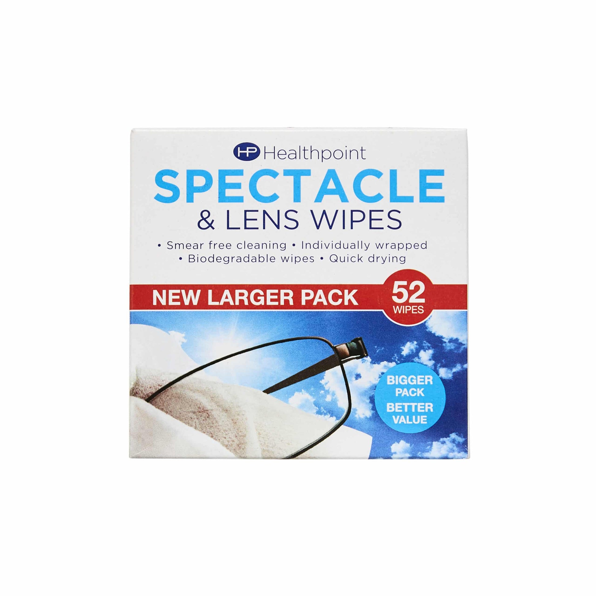 Description: Healthpoint Spectacle & Lens Wipes are pre-moistened wipes designed for the convenient and effective cleaning of glasses and optical lenses. This pack contains 52 individually wrapped wipes, perfect for on-the-go use. They are formulated to safely and quickly clean spectacles, sunglasses, and other types of optical lenses, including camera lenses, without leaving streaks or residue.