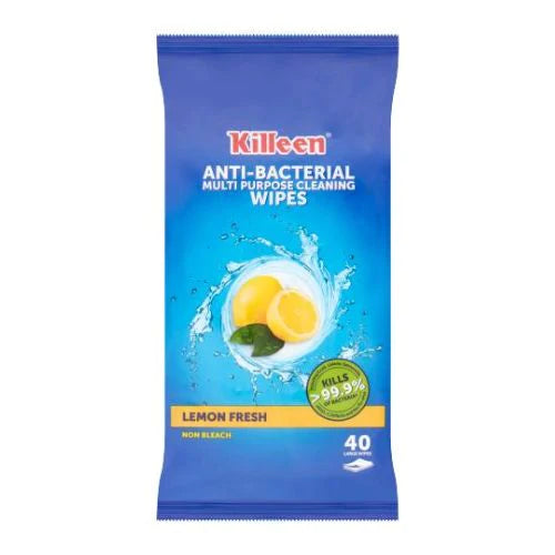 Description: Killeen Lemon Fresh Antibac Wipes are pre-moistened, disposable wipes designed for cleaning and disinfecting various surfaces. Infused with a lemon-fresh scent, these wipes not only clean but also leave a pleasant fragrance behind. The pack contains 40 wipes, each formulated to kill bacteria and ensure hygiene in your home or office. They are suitable for use in kitchens, bathrooms, and on most hard surfaces.